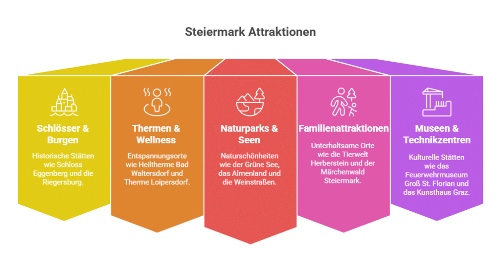 - Naturparks & Seen – darunter der Grüne See, das Almenland oder die Weinstraßen